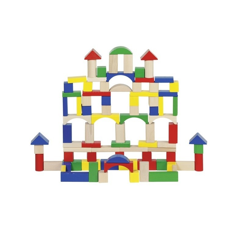 Baril de 100 blocs de construction en bois : cubes, triangles, cylindres, pavés, ponts.