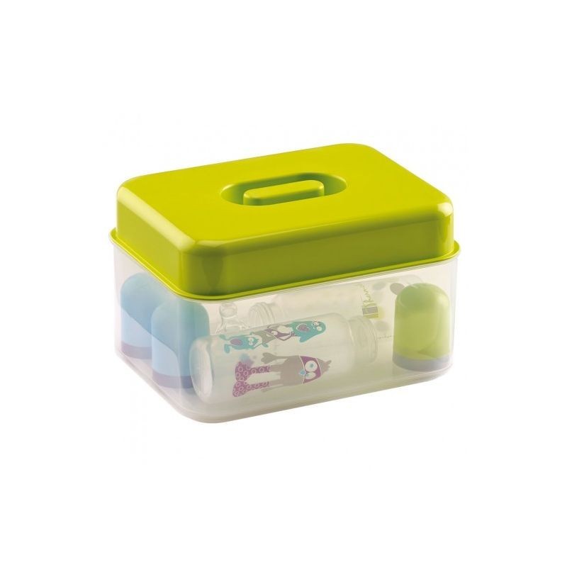 Le stérilisateur double usage permet une stérilisation à chaud au four micro-ondes ou à froid avec des comprimés de stérilisation qui détruisent les bactéries. Il convient pour 4 biberons standards ou 3 biberons larges. Il peut également être utilisé pour stériliser certains petits jouets ou accessoires portés à la bouche de bébé.