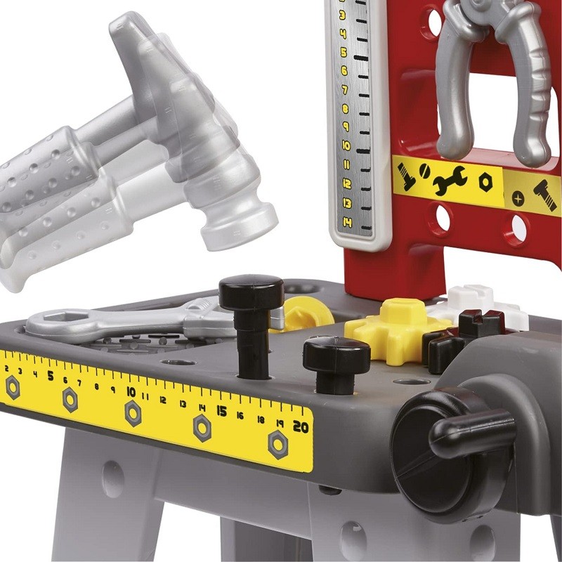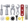 Ce pack comprend l'essentiel du bricolage : 1 petit établi, 1 tournevis, 1 marteau, 1 pince, 1 clé à molette, 1 règle, des engrenages, des vis..