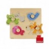 Un premier puzzle à encastrement de 4 pièces sur un thème apprécié des tout-petits. Votre enfant s'amusera à associer les animaux de compagnie (chat, chien, oiseau et poisson rouge) à leur silhouette. Ce puzzle est doté de pièces à gros boutons spécialement conçus pour les petites mains. Tout en s'amusant, votre enfant exercera sa patience, son sens de l'observation et sa motricité fine. Un jeu composé de 4 pièces à bouton faciles à manipuler. Dim. du socle en bois de 22 x 22 cm