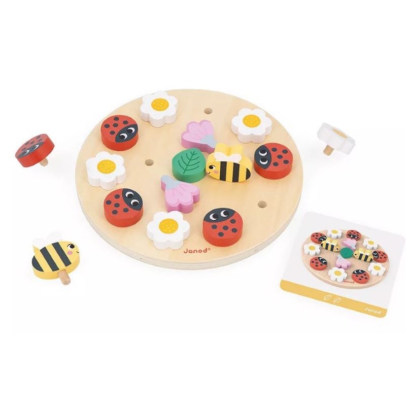 Un jeu de disposition d'abeilles, de coccinelles et de fleurs pour découvrir la symétrie et les suites logiques. 2 modes de jeu différents sont proposés pour s'adapter à l'âge et au niveau des enfants. Un premier atelier propose simplement de réussir à placer seul les éléments sur le plateau en se référant à une carte modèle. Une deuxième activité, en binôme, propose de jouer sur la compréhension orale. Un adulte décrit la carte modèle sans la montrer à l'enfant afin que celui-ci puisse être capable de bien replacer chaque élément. "Au centre du plateau, il y a une abeille", "Autour de l'abeille, il y a 4 marguerites", "Derrière une des marguerites se trouve une coccinelle". Un jeu de repérage spatial pour accompagner l'enfant tout au long de la maternelle.