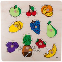Encastrement en bois avec 8 fruits. Les boutons sont gros pour faciliter la préhension des plus jeunes. Un bel encastrement pour une première découverte des fruits à la crèche et en petite section de maternelle.
