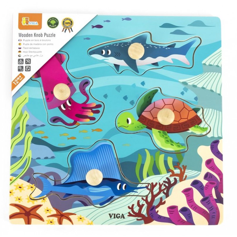 Puzzle d'encastrement en bois sur le thème des animaux de la mer, dès 12 mois.