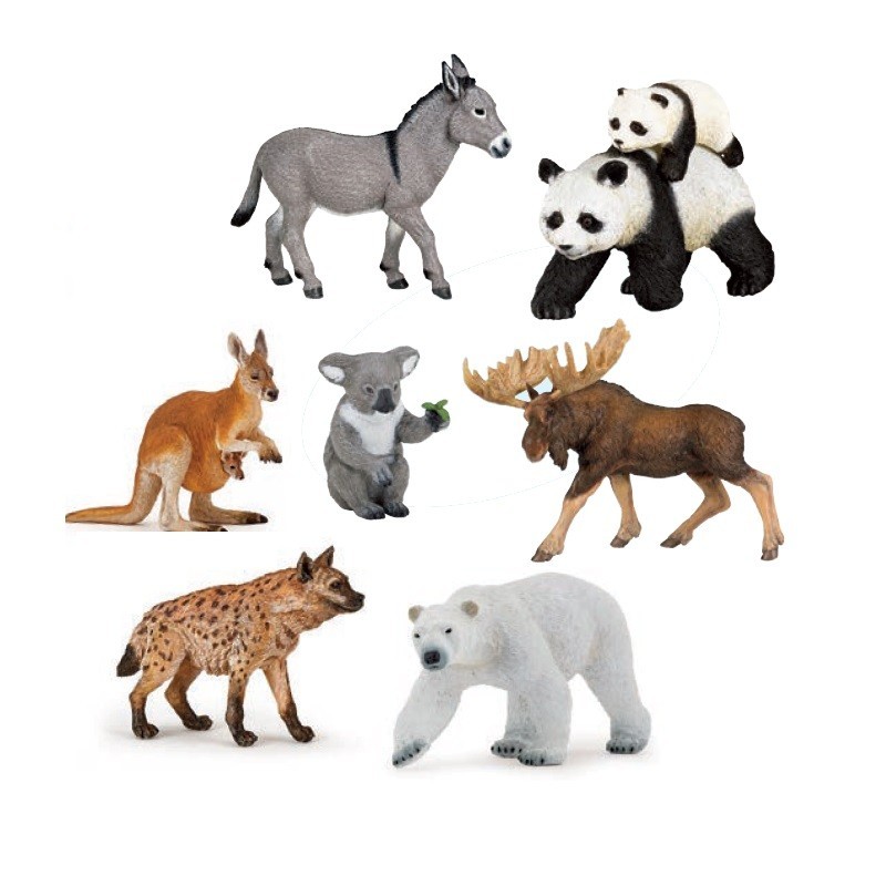 Contenu : 1 kangourou, 1 hyène, 1 âne, 1 panda, 1 ours polaire, 1 élan et 1 koala. Le tout est en plastique, entre 9 à 13 cm de long par figurine.
