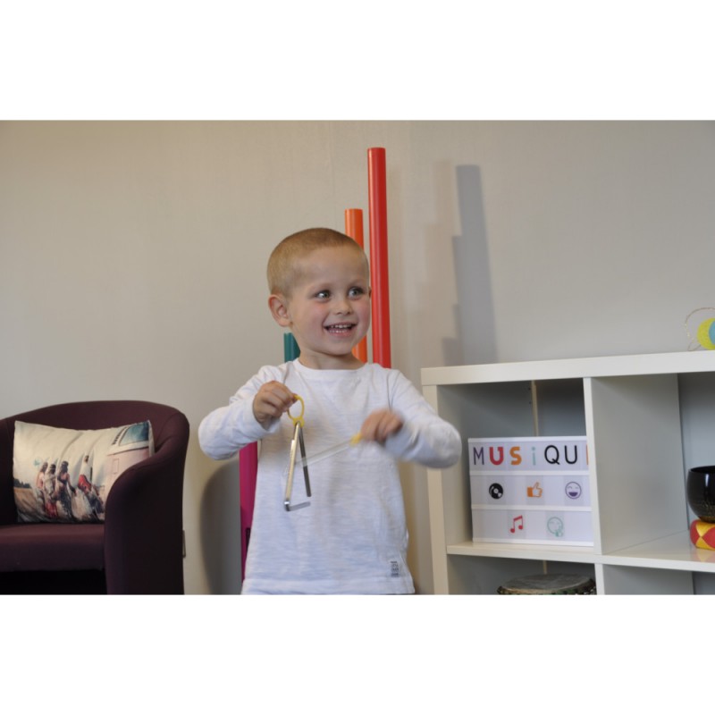 Le triangle est un instrument de musique qui révèle des sons très fins. Malgré sa simplicité et sa petite taille, ce triangle se remarque facilement par sa sonorité. De multiples possibilités s'offrent à l'enfant pour écouter les sons cristallins et marquer le rythme.