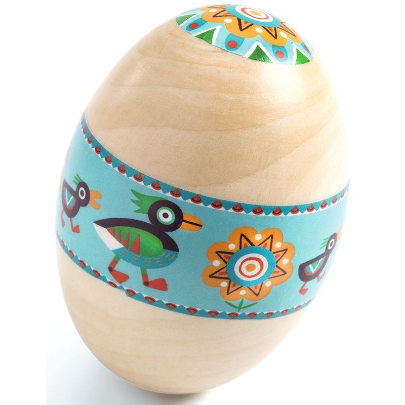 Oeuf maracas en bois, joliment illustré. Un instrument tout simple, indispensable à la crèche et à l'école, pour s'éveiller à la musique, apprendre à différencier les sons et développer son sens rythmique.