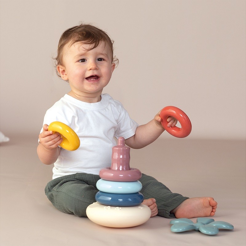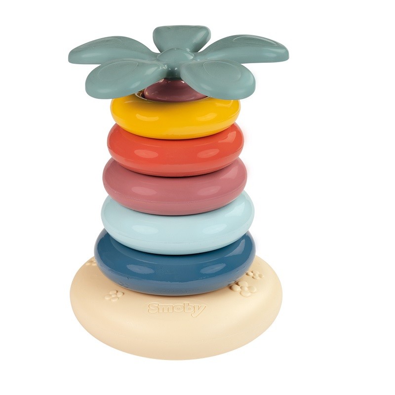 Une fois les anneaux empilés, bébé pourra terminer la pyramide en ajoutant la fleur, pouvant être mise en rotation.