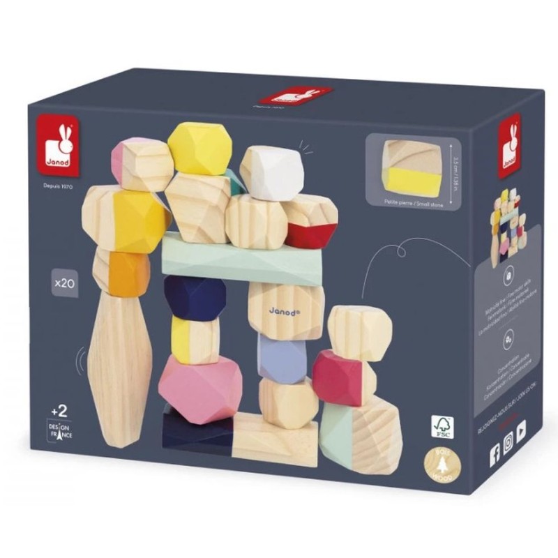 Contenu : 20 pierres en bois de 3 tailles différentes : 6 x 2,5 x 12 cm ; 5,5 x 4,5 x 5 cm ; 3,5 x 3,5 x 3,5 cm.