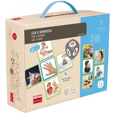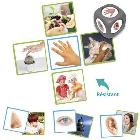 Contenu : 50 tuiles en carton rigide et résistant (9 x 9 cm): 10 photographies des organes sensoriels et 40 photographies de situations de la vie réelle; un dé (3,5 cm), guide d'activités non inclus à télécharger (onglet règle de jeu).