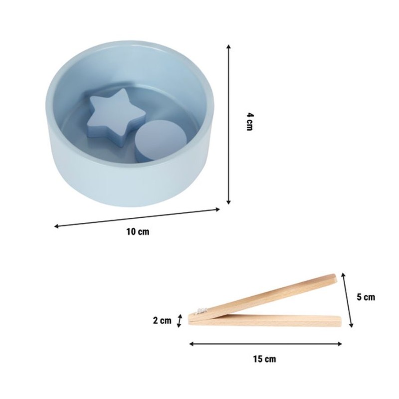 Contenu : set en bois composé de 5 bols (Ø du bol : 10 cm) de 5 couleurs différentes, de 15 éléments (3 ronds, 3 triangles et 3 étoiles de 5 couleurs différentes), et 2 pinces (15 x 2 x 5 cm).