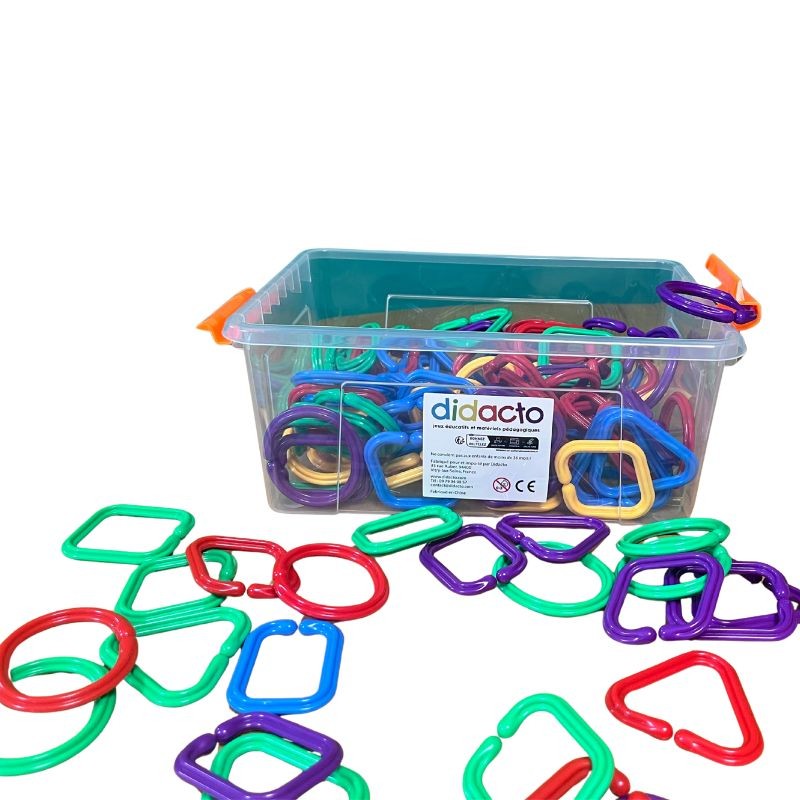 Contenu : 120 anneaux en plastique, de forme ronde, triangulaire ou carrée, et de couleur rouge, violette, bleue, verte ou jaune, dans un bac de rangement en plastique translucide (28 x 20 x 12 cm).