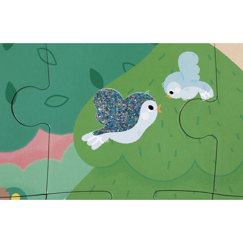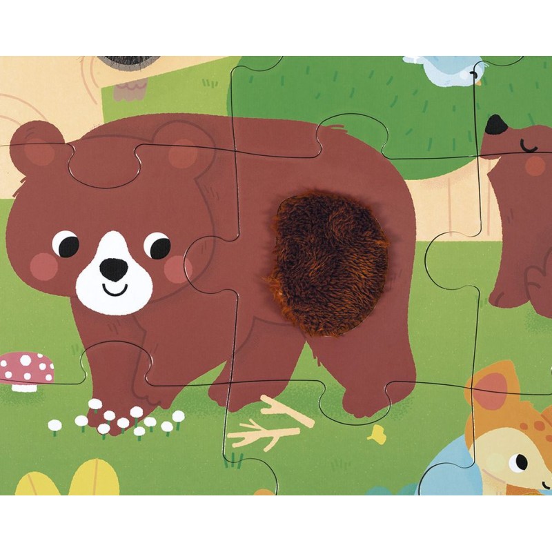 Une fois le puzzle de 20 pièces reconstitué, l’enfant prolonge l’expérience grâce aux 7 pièces tactiles intégrées à la scène. Le dos de l’ours et du daim, la queue du raton laveur et du renard, les ailes de l’oiseau ou encore le corps du hibou offrent autant de surfaces à explorer. Ces éléments invitent l’enfant à découvrir et comparer différentes imitations de textures, à observer, toucher et reconnaître, du bout des doigts, les matières associées au monde animal. Ce puzzle tactile favorise le développement de la motricité fine, la coordination œil-main tout en stimulant le sens du toucher.