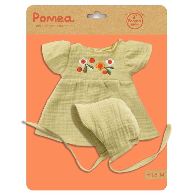 Contenu : robe et beguin en gaze de coton pour poupée de 28 à 34 cm. Lavable en machine à 30°.
