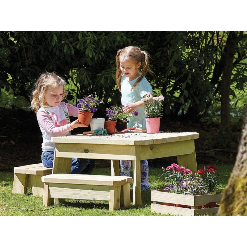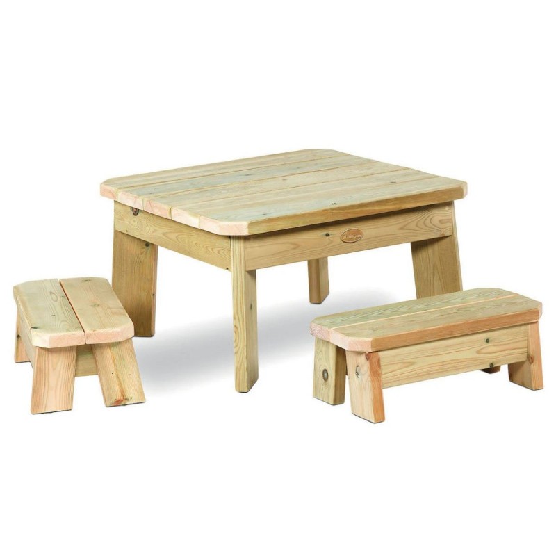 Cette table carrée avec ses deux bancs constitue un mobilier adapté à la taille des enfants dès 2 ans. Solide et stable, elle est conçue en bois massif avec des coins arrondis pour assurer la sécurité des tout-petits. Sa surface plane et large permet de nombreuses activités en plein air.
