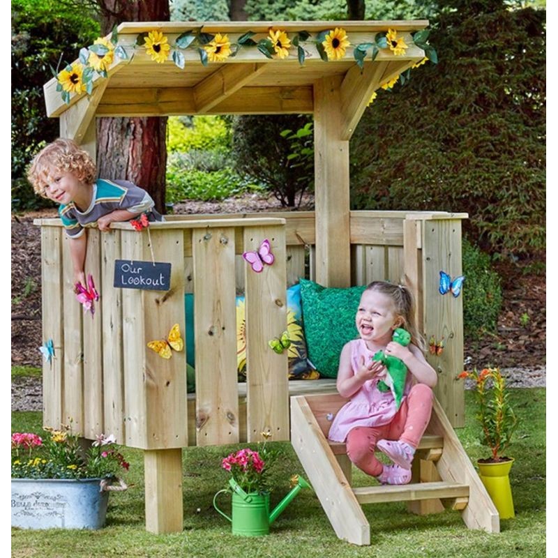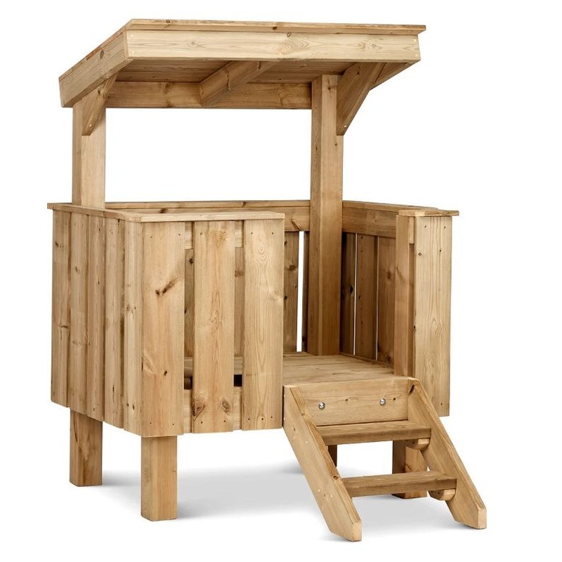Cette cabane en bois massif est composée d'une plateforme surélevée accessible par de petites marches. Un toit suspendu complète l'ensemble et donne un esprit cocon à ce mobilier d'extérieur. Conçu en bois massif, avec des surfaces lisses et des angles arrondis, cette cabane est une invitation à l'exploration ou au temps calme en toute sécurité. Un espace fonctionnel adapté au tout-petits dès 2 ans.