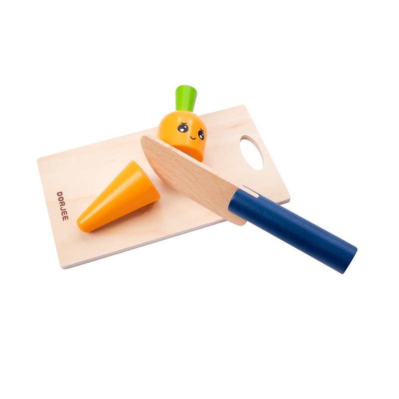 L'ensemble comprend 16 fruits et légumes, 2 assiettes, des couteaux à découper, des planches à découper et un sac en coton.