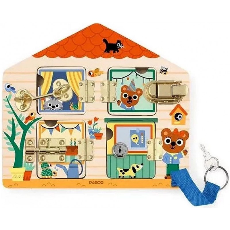 Contenu: 1 tableau en bois en forme de maison (21 x 26 cm) avec 4 portes et 4 sortes de fermetures (la clé est accrochée au tableau).