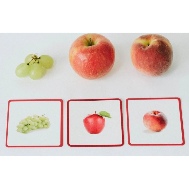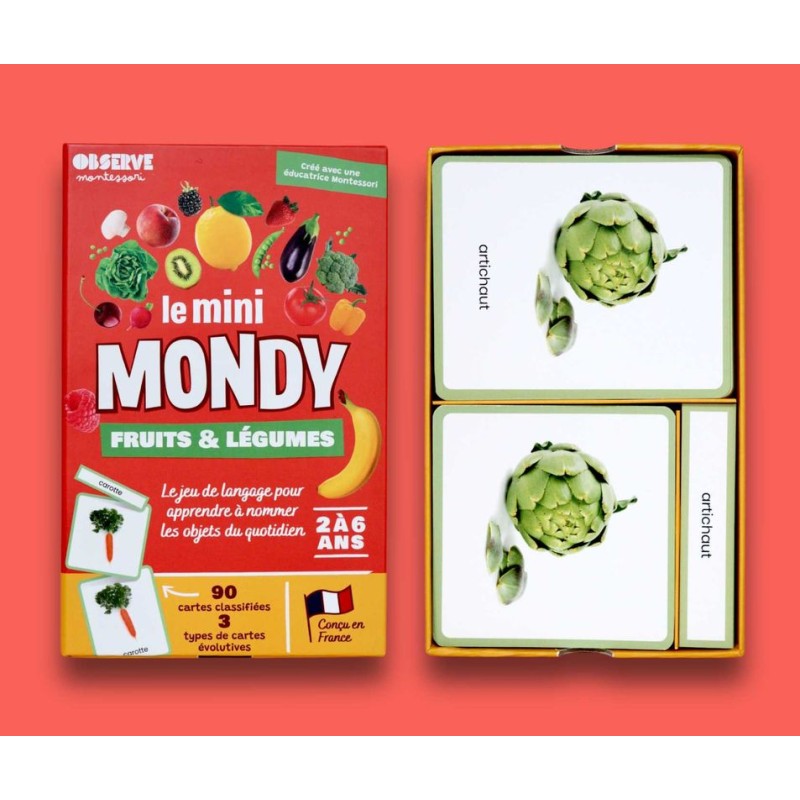 Le coffret Mini Mundy – Fruits et légumes se compose de 2 séries de 30 cartes : une première avec uniquement les visuels, une seconde avec les visuels accompagnés du nom écrit, ainsi que 30 étiquettes comportant uniquement les mots. On dispose ainsi de 3 types de supports complémentaires : image seule, image + mot, et mot seul. Les cartes présentent de véritables photographies, permettant une représentation fidèle des fruits et légumes et facilitant le lien avec le quotidien des enfants.