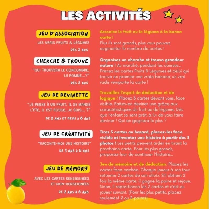 De nombreuses activités sont possibles avec ces cartes afin de permettre aux enfants d 'enrichir leurs représentation du monde et de favoriser leur expression orale (memory, devinettes, qui est-ce, mimes, etc...). Un livret et une fiche d’activités complètent le coffret, pour une prise en main facile et rapide. Un matériel complet, développé en partenariat avec l’Association Montessori Internationale, pour enrichir le vocabulaire et accompagner l'entrée dans la lecture.