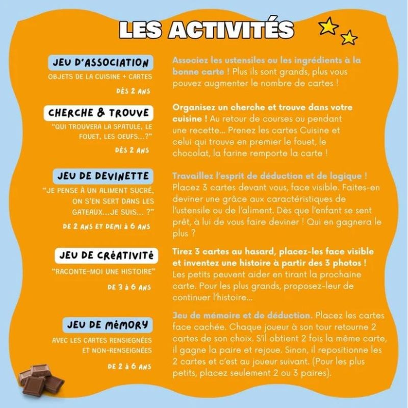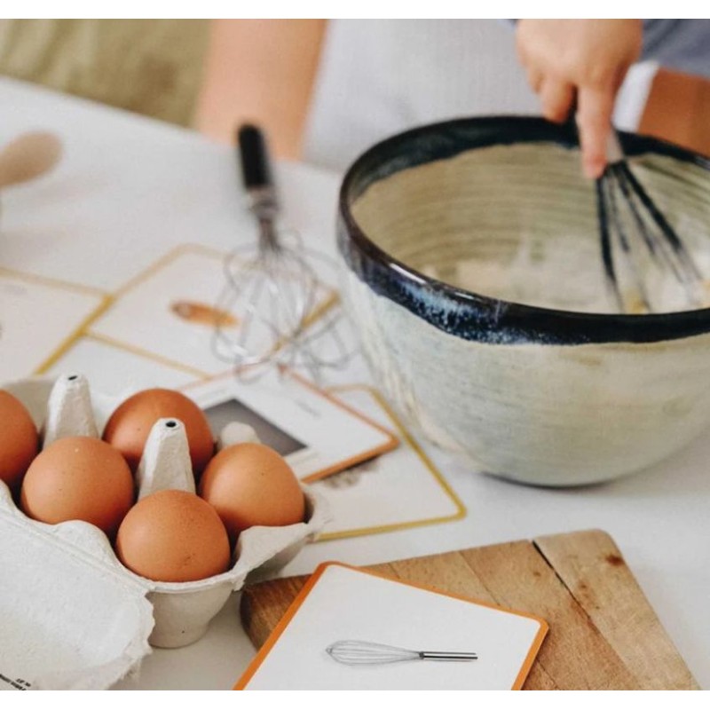 Le coffret Mini Mundy – Loisirs se compose de 2 séries de 30 cartes : une première avec uniquement les visuels, une seconde avec les visuels accompagnés du nom écrit, ainsi que 30 étiquettes comportant uniquement les mots. On dispose ainsi de 3 types de supports complémentaires : image seule, image + mot, et mot seul. Les cartes présentent de véritables photographies, permettant une représentation fidèle des ustensiles de la cuisine et des aliments et facilitant le lien avec le quotidien des enfants.