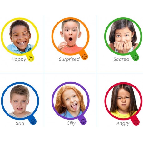 Miroir interactif pour découvrir 6 émotions. Il s'agit d'un outil original avec 6 portraits que l'on peut alternativement faire coulisser et placer au-dessus du miroir. L'enfant peut ainsi se voir dans le miroir et imiter l'émotion de la photo en question. Le miroir peut s'utiliser en jeu libre ou en interaction avec un adulte. Les photos montrent un enfant heureux, surpris, effrayé, triste, stupide et en colère. Un miroir adapté aux enfants pour les aider à reconnaître et à s'identifier aux différentes émotions illustrées.