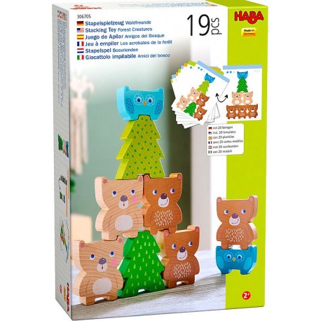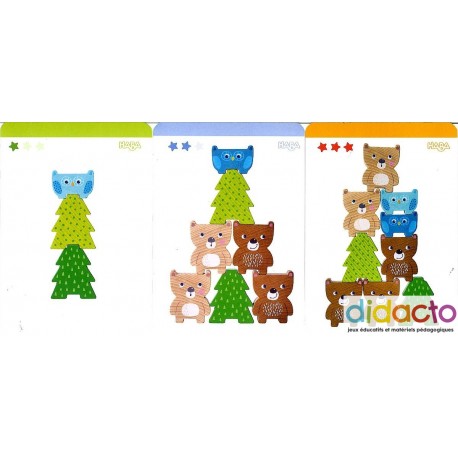 Jeu d'adresse avec des sapins, des ours et des hiboux acrobates. Les enfants peuvent créer des empilements et inventer des histoires à leur guise. Ils disposent également de cartes avec des modèles à reproduire, de trois niveaux de difficulté. Un jeu superbe qui sollicite la motricité fine et le repérage spatial!