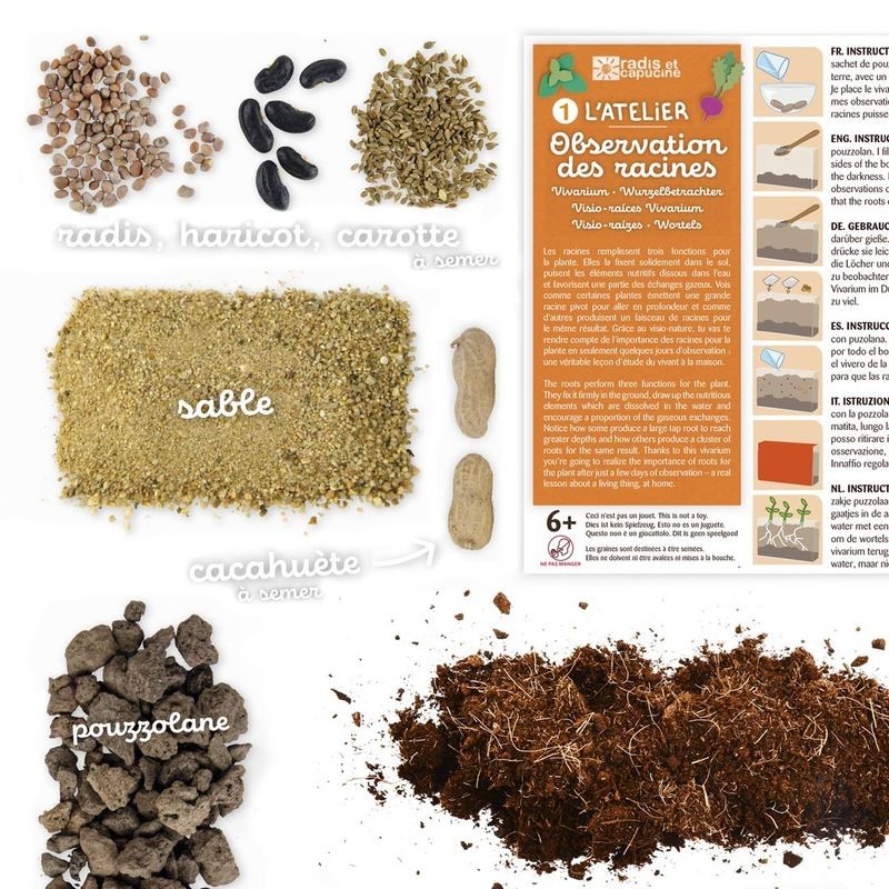 Ce kit permet aux enfants d’explorer un monde souvent invisible : ce qui se passe sous la terre. Ils préparent le vivarium en ajoutant de la terre, sement quelques graines puis introduisent des lombrics. Grâce aux parois transparentes des vivariums, ils peuvent observer les racines fines d'un haricot, la pousse d'un long radis blanc et même la pousse des tubercules d'arachide ou cacahuètes sous terre et suivre les déplacements des lombrics dans le sol.