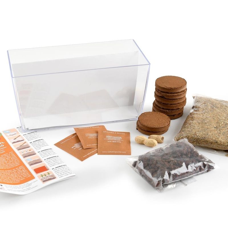 Contenu : 2 vivariums (26 x 12 x 13 cm), 1 sac de sable de 1,6 kg, 1 sac de terreau 3l, 3 graines d'arachide, des graines à semer : 2 sachets de radis rave, 2 sachets de carottes, 2 sachets de haricots, 600g de pouzzolane, 1 notice d'explication.